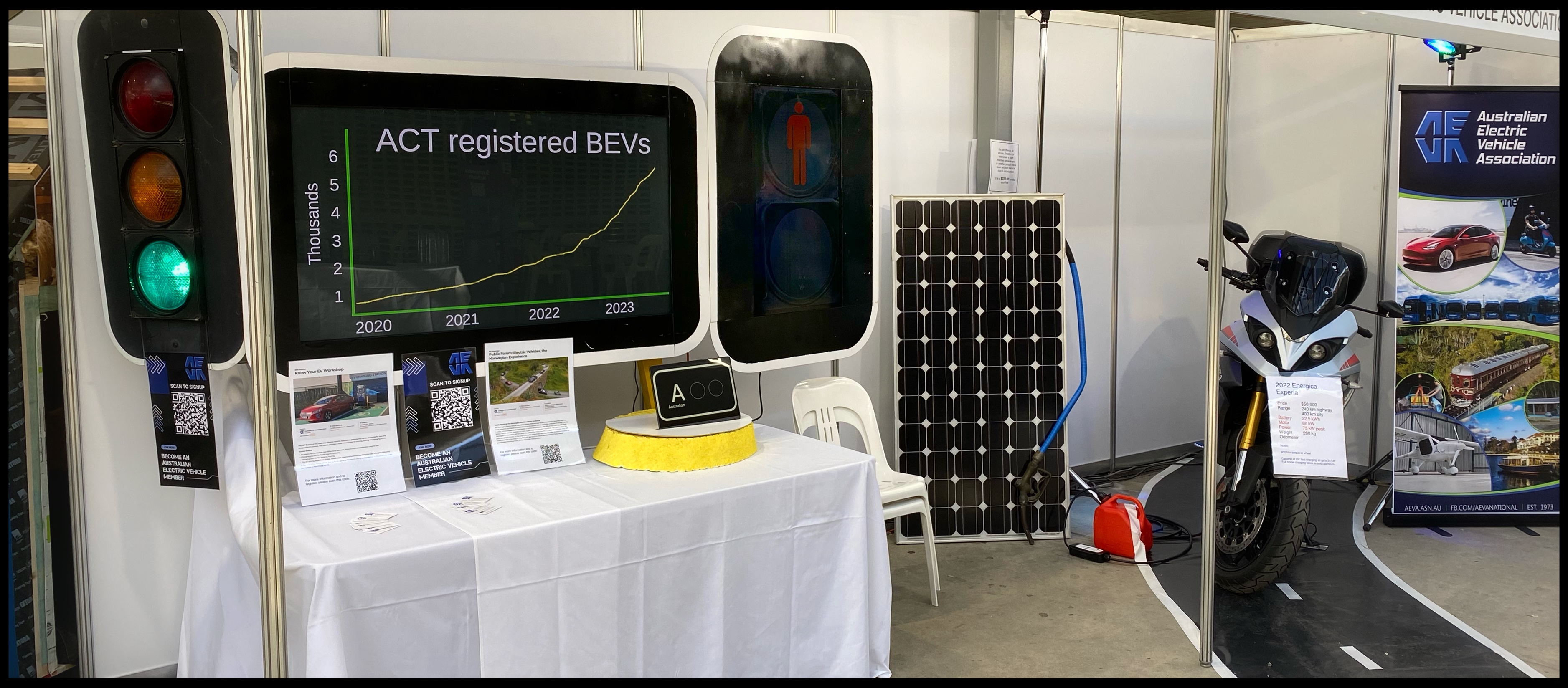 AEVA-ACT also had an inside stall promoting membership and advising people about the AEVA outside display and rides. The stall featured a traffic lights theme, solar power and an “serious” electric motorbike to attract attention.