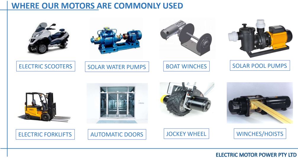 Electric Motor Power Pty Ltd supplies all forms of electric motors, including DC motors, AC motors, Servo motors, gears and bevel drives, and an array of inverters and motor speed controllers to suit.