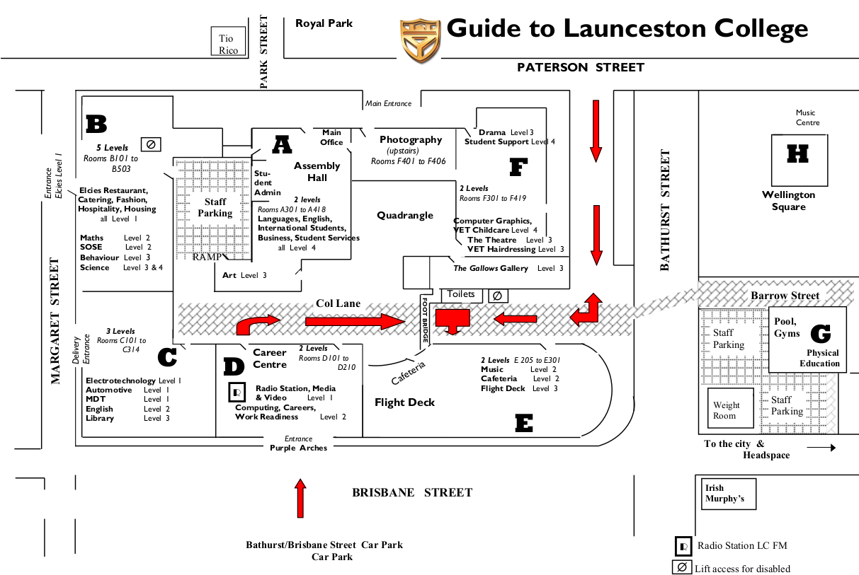 The main entrance near the purple arches will probably be closed, so enter from Paterson St. as per red arrows on the map.